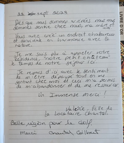 Certains ont laissé quelques mots... des traces de moments de bonheur passés dans cet endroit enchanteur. Merci à chacun et chacune d'avoir pris la peine de nous écrire! - Nadia & Nicolas